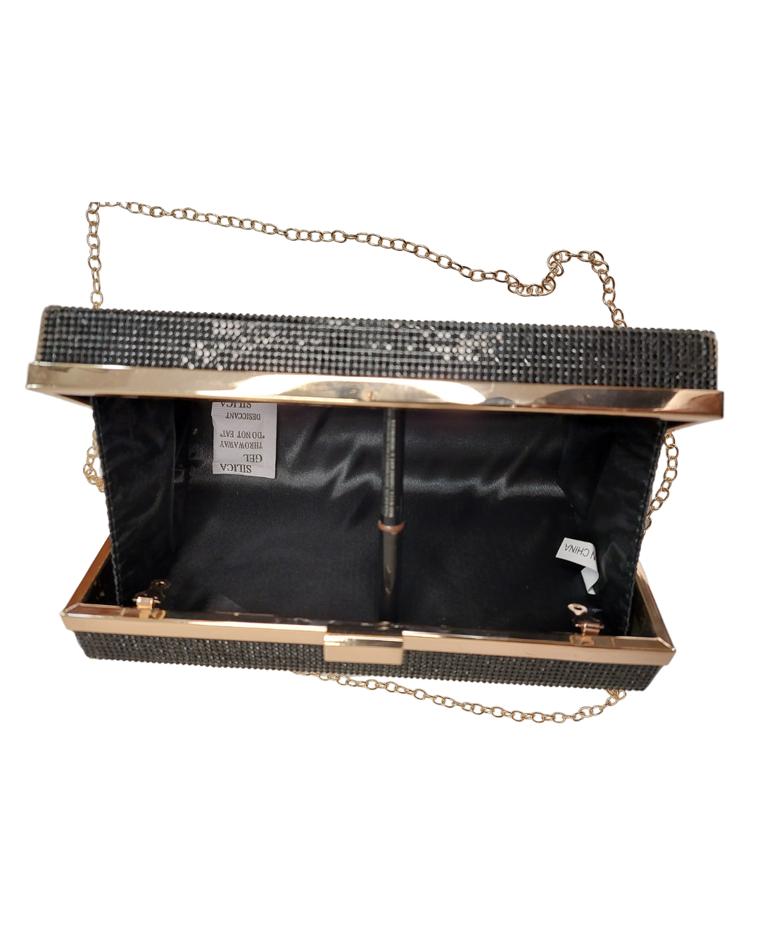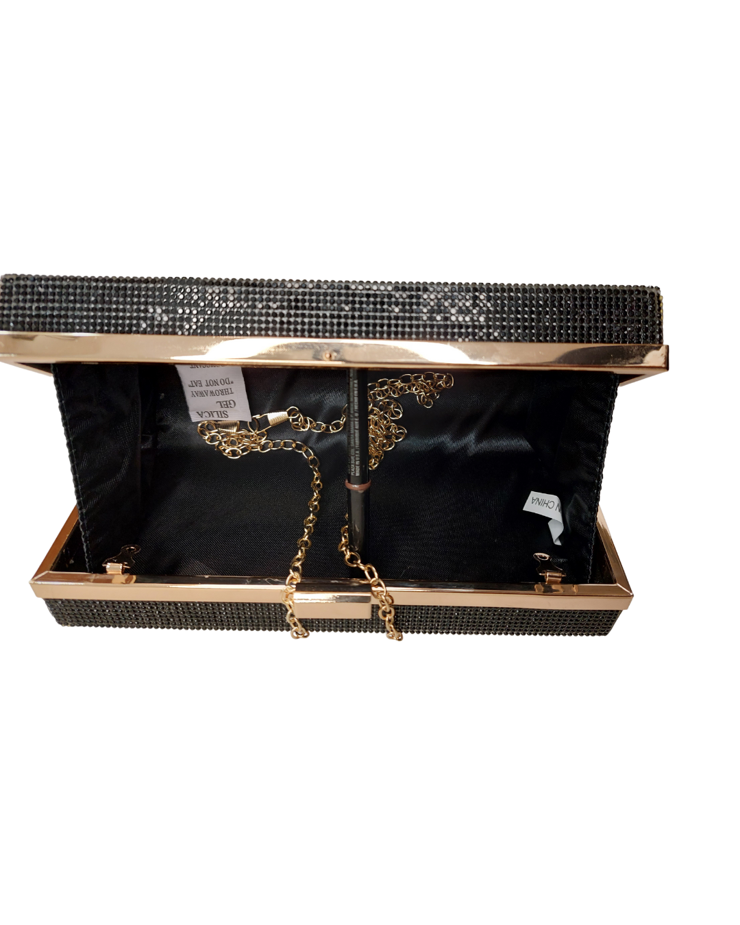 Elevate your evening look with this striking black and gold rhinestone clutch bag, a dazzling accessory that blends functionality with a flair for the dramatic. The bag showcases an eye-catching graffiti pattern, accented with gleaming rhinestones that set off the dark fabric, creating a sophisticated yet edgy aesthetic. Ideal for a night out or a special occasion, this clutch is equipped with a detachable strap, allowing for versatile carrying options. The interior is lined with a black fabric to protect your essentials, while the snap closure ensures they stay secure. Gold hardware and a matching metal strap add a touch of elegance to this small yet impactful piece.